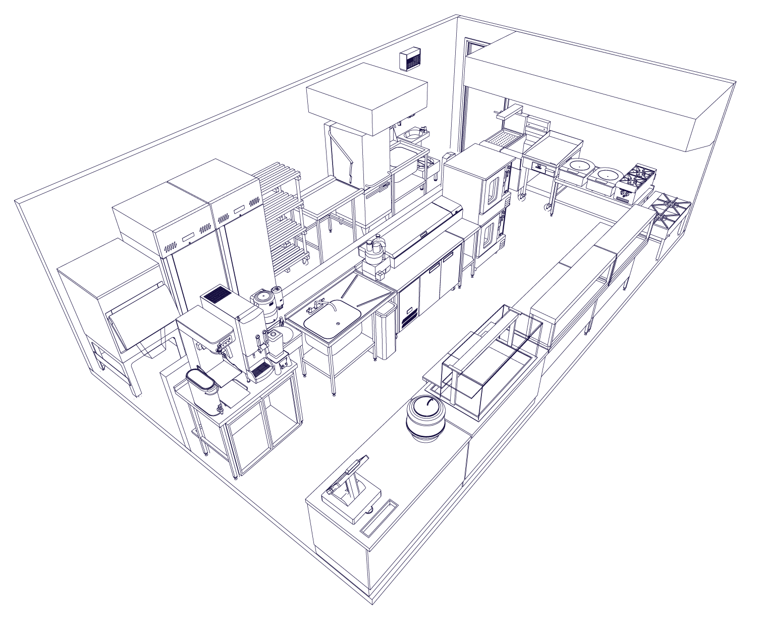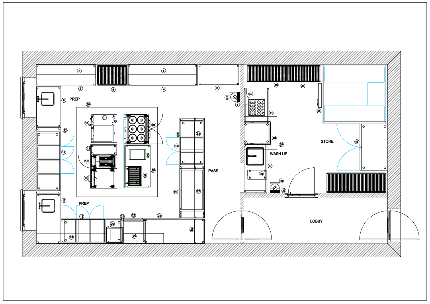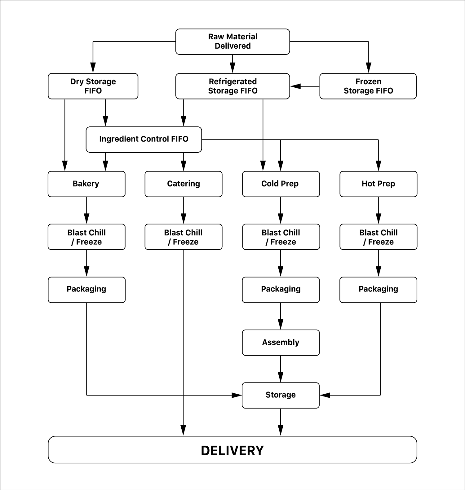 - Receiving section, storage section, preparation room, production section, service package section & dish cleaning section